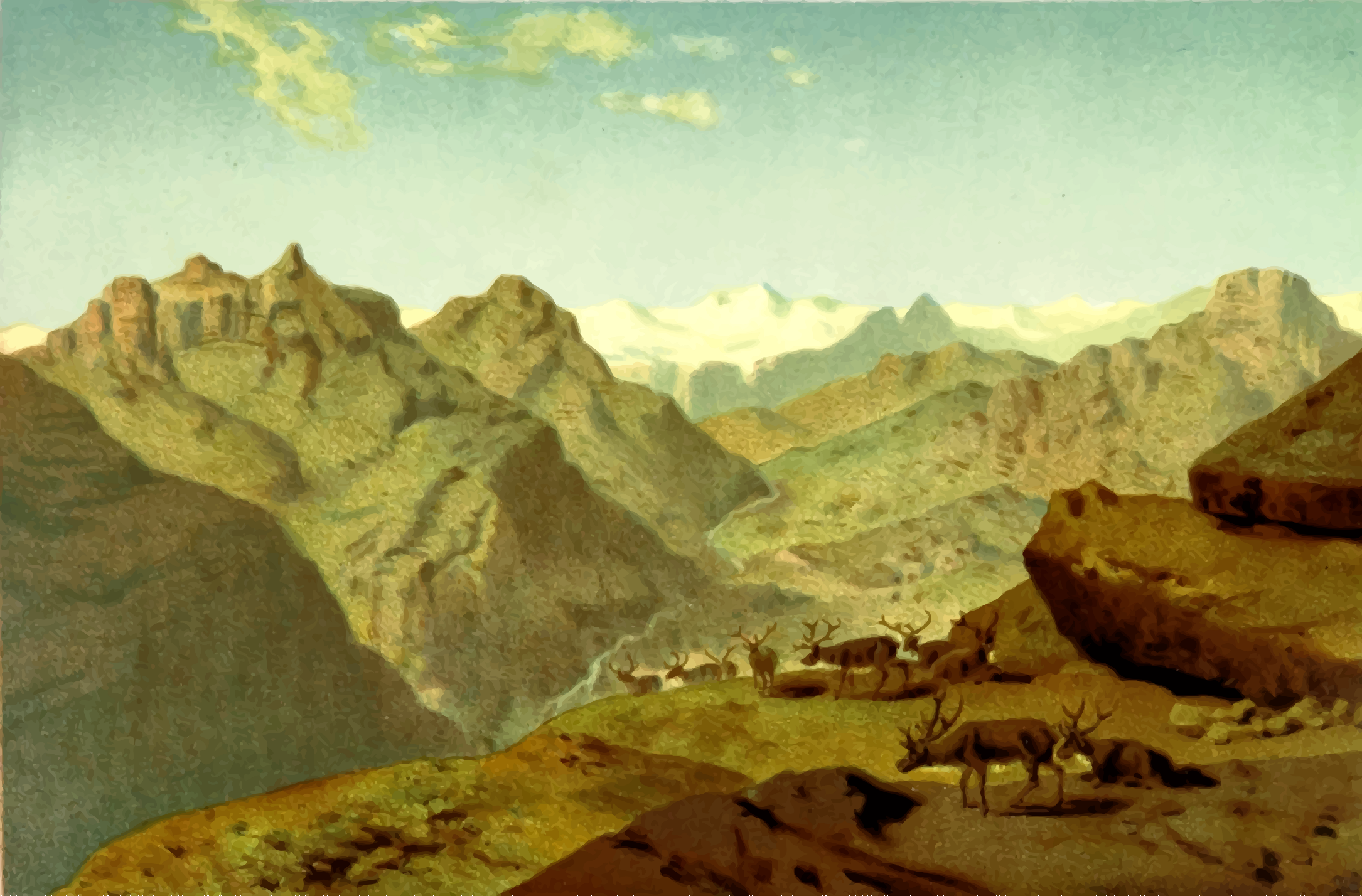 This depicts a beautiful mountainous landscape with a herd of deer grazing on the side of a hill. There are at least 13 deer scattered throughout the scene, some closer to the foreground and others further away in the background. The mountains in the distance provide a stunning backdrop for this serene moment. The overall atmosphere is peaceful and picturesque, showcasing nature's beauty.