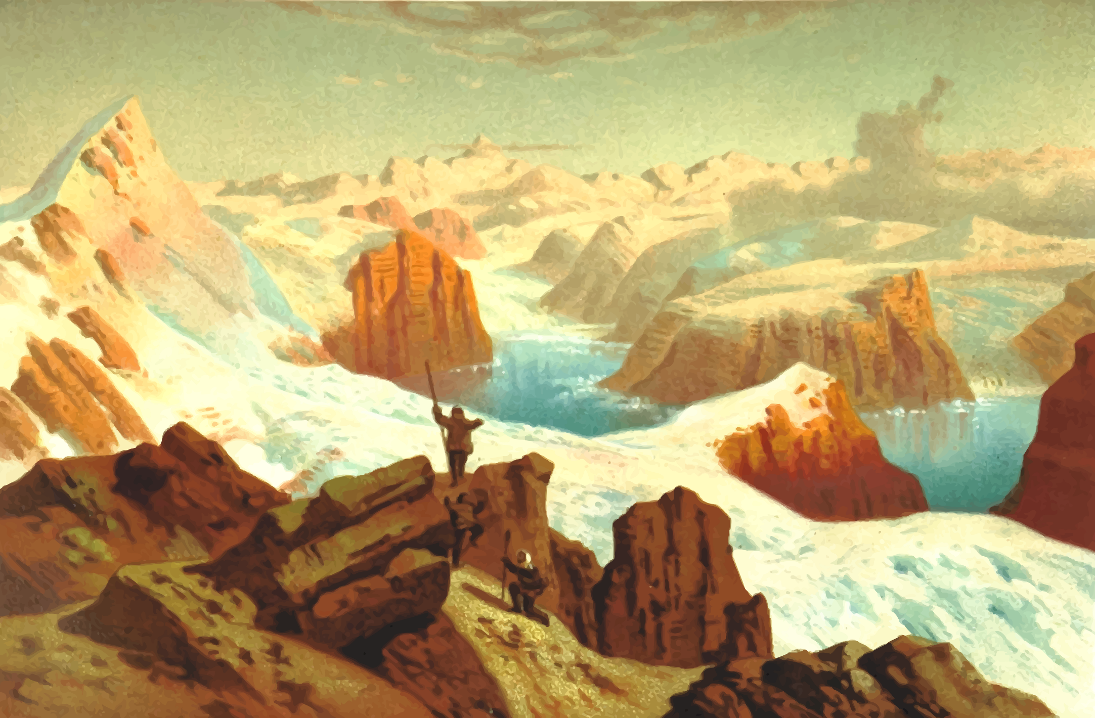 This depicts a man standing on top of a rocky mountain, overlooking a beautiful landscape. He is holding a gun in his hand and appears to be taking aim at something below him. The scene also features several other people scattered throughout the area, some closer to the foreground while others are further away. The landscape itself consists of a mix of mountains, rocks, and water, creating an impressive backdrop for this adventurous moment. There is a body of water visible in the distance, with a few boats floating on its surface. The overall atmosphere suggests that this could be a painting or drawing capturing a thrilling outdoor experience.