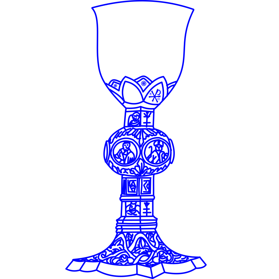 This features a blue, ornate cup or vase with intricate designs on it. It appears to be an artistic drawing of the vessel, possibly depicting a wine glass or another type of cup. The design is quite detailed and elaborate, showcasing the craftsmanship that went into creating this unique piece of art. The blue color adds a striking contrast to the intricate patterns on the vase, making it an eye-catching display.