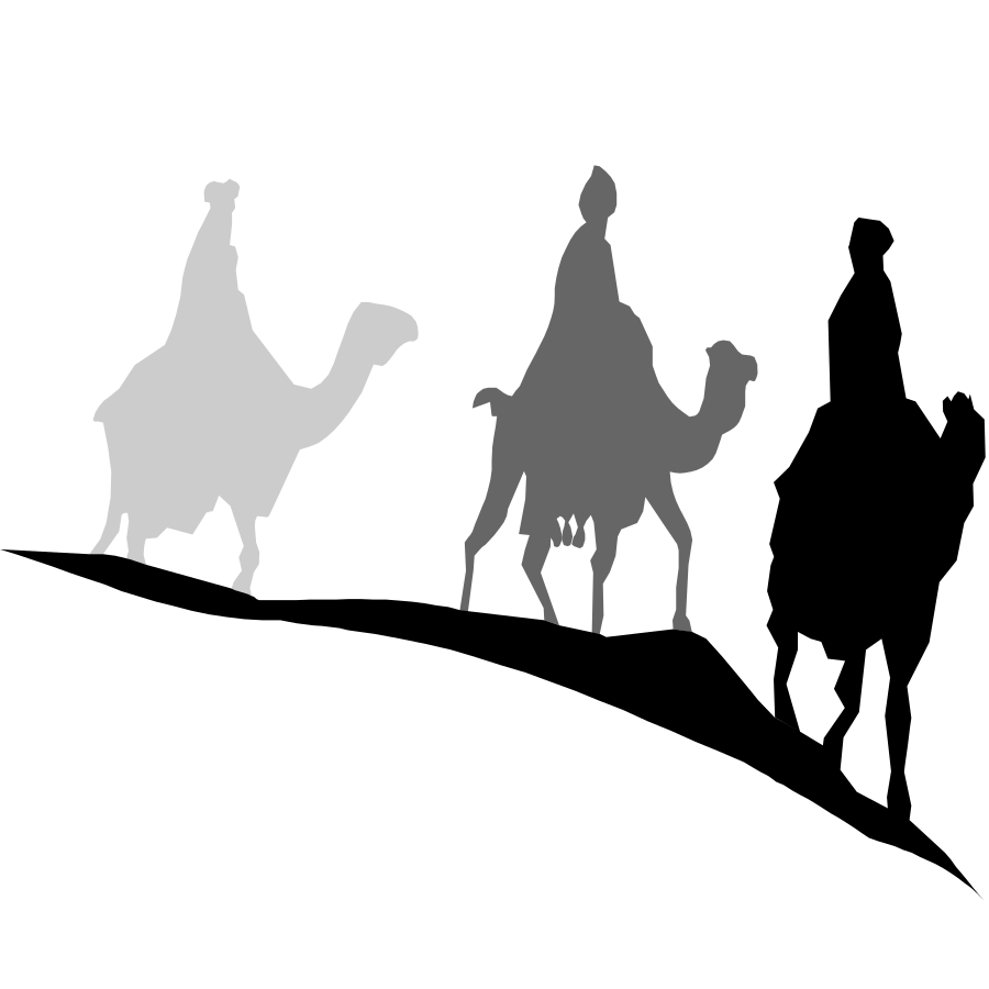 This features a silhouette of three people riding on camels, with one person in the middle and two others on either side. They are all positioned at different heights, giving an impression of depth to the scene. In addition to the people and camels, there is also a horse present in the background, adding variety to the mode of transportation depicted. The overall composition creates a sense of movement and adventure as these individuals travel together on their journey.