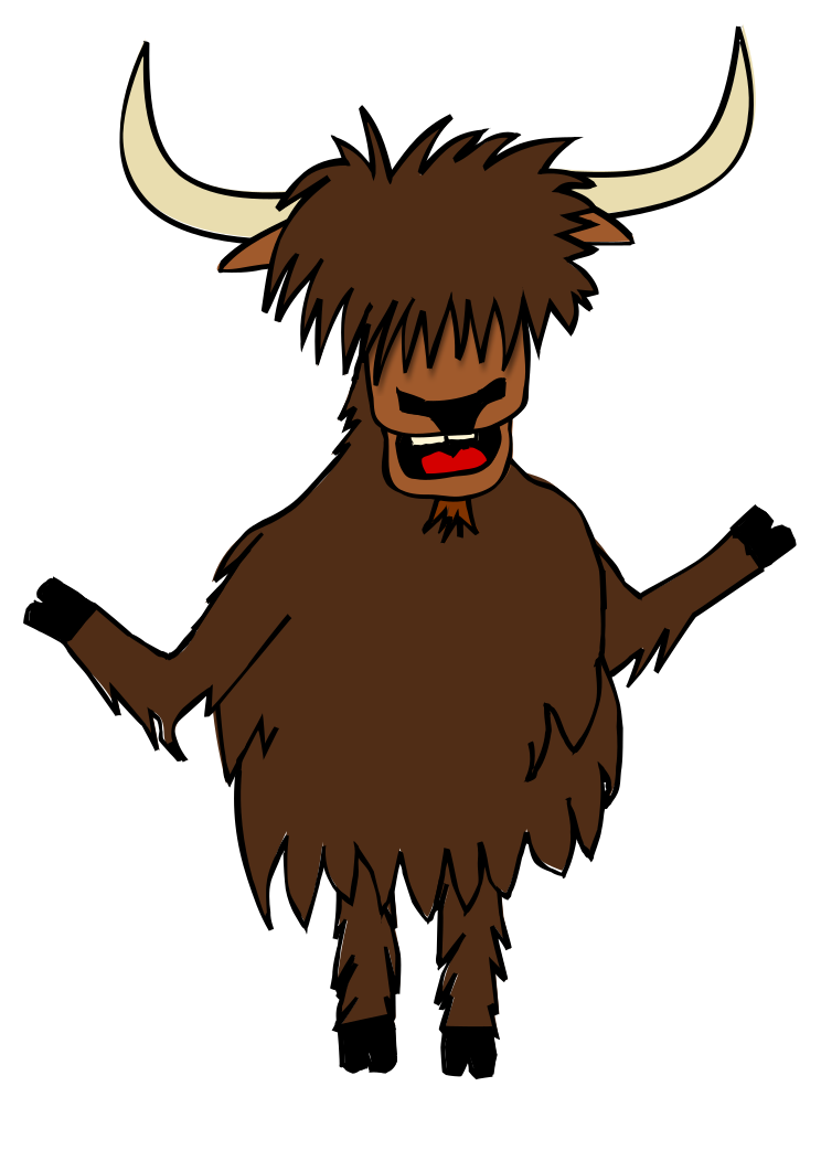 This features a cartoon drawing of a large, furry bison with horns and a beard. It appears to be standing on two legs and has an angry expression on its face as it looks off into the distance. The bison's body is covered in brown hair, giving it a distinctive appearance. Its facial features are also prominent, including its eyes, nose, and mouth. Overall, this colorful drawing captures the essence of a wild animal with an intense expression.