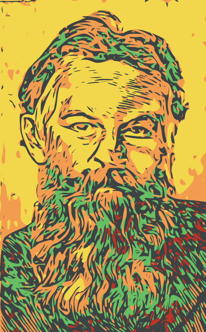 This features a man with a beard and mustache, wearing glasses. He appears to be an older gentleman with a stern expression on his face. The man is the main focus of the picture, taking up most of the frame. The colors in the image are vibrant and varied, giving it a unique and artistic appearance.