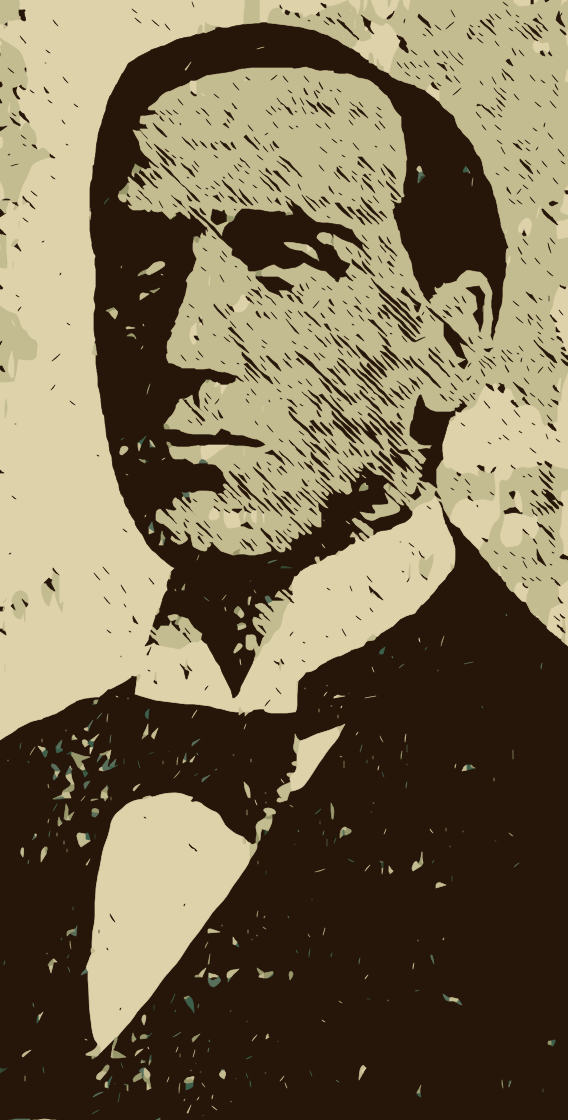 This is a black and white photograph of an older man wearing a suit, tie, and bowtie. He has a stern look on his face as he stares into the camera. The photo appears to be vintage or possibly a sepia-toned image, giving it a classic feel. The man's attire suggests that this could have been taken during an earlier time period when formal wear was more common.