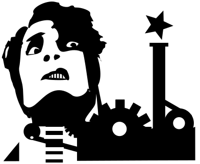 Tags: art, clip art, clipart, face, image, man, media, person, public domain, svg, black and white, scary, creepy, evil, angry, mouth open, teeth showing, gear, machinery, factory, industrial, clock, time, star, tower, building