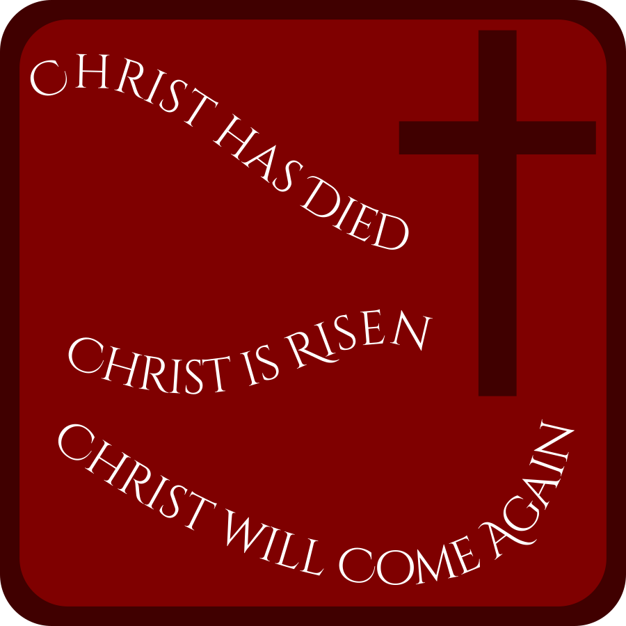 This features a red background with a cross prominently displayed in the center. Surrounding the cross are several phrases written in white, including "Christ has died," "Christ is risen," and "Christ will come again." These phrases create an interesting visual effect as they appear to be part of a larger circle or design. The combination of the red background and the white text creates a striking contrast that draws attention to the cross and its message.