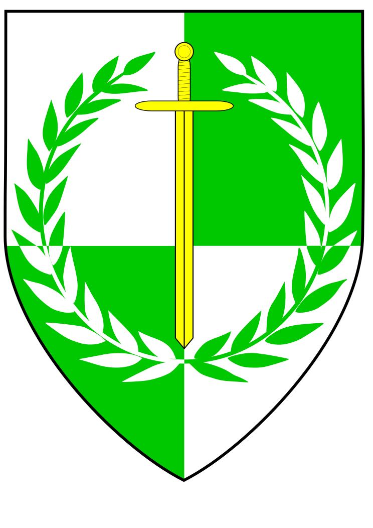 This features a green and white shield with an upside down sword inside of a laurel wreath. The shield is divided into four sections, each featuring the same design elements. The sword is located in the center of the shield, surrounded by the laurel wreath. This unique design gives the impression that the sword is being held up or displayed on the shield.