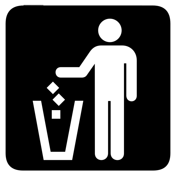This features a black and white sign with an illustration of a person throwing trash into a garbage can. There are several small diamond shapes scattered around the scene, possibly representing the trash being thrown away. The overall composition of the image is simple yet effective in conveying the message of proper waste disposal.