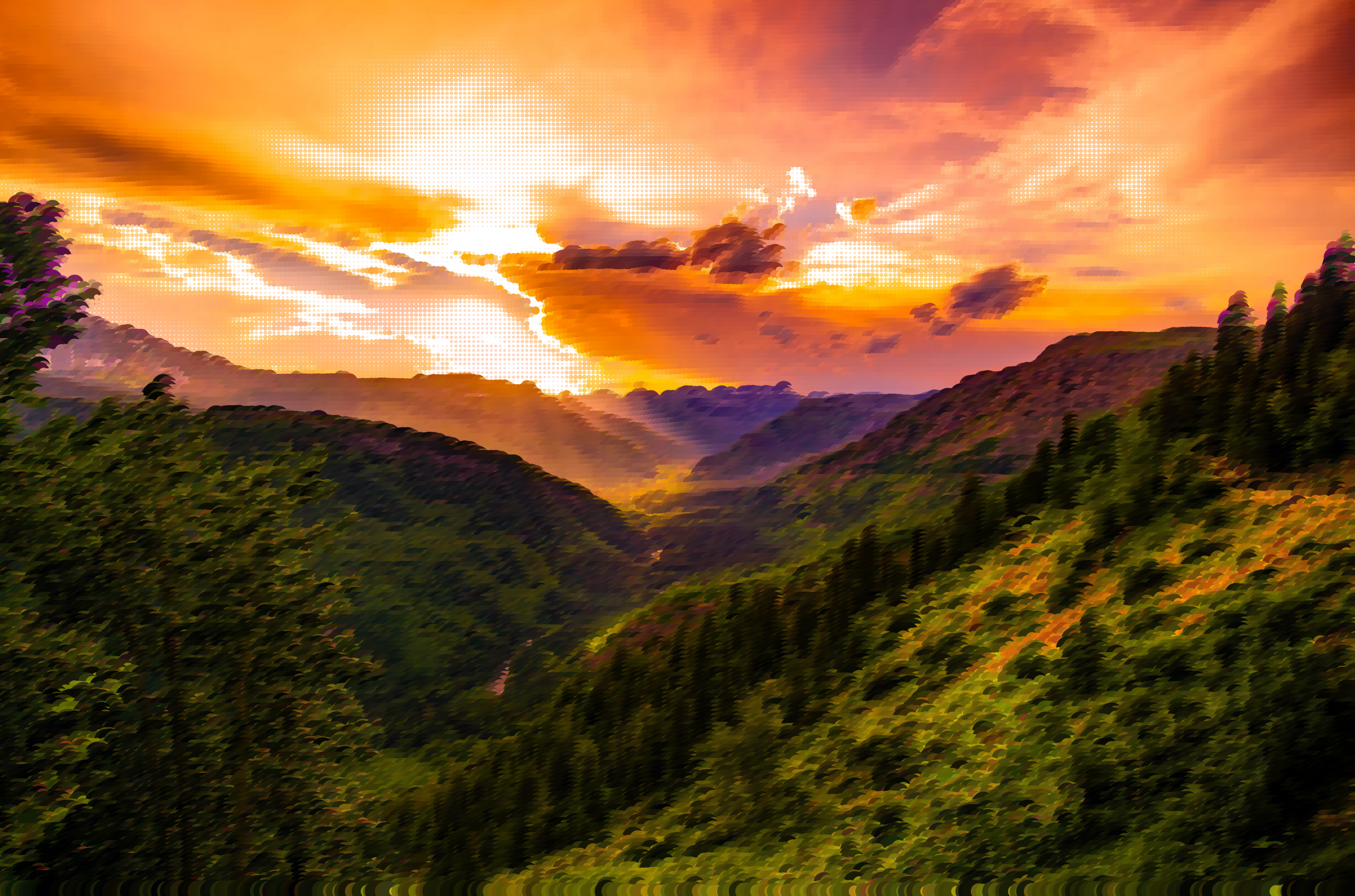 This captures a beautiful sunset over a lush green valley with mountains in the background. The sky is filled with vibrant colors, creating an idyllic atmosphere. In the foreground, there are trees and bushes that add to the natural scenery of the landscape. The sun appears to be setting behind the mountain range, casting a warm glow over the entire scene. This picturesque view showcases the beauty of nature and the tranquility of the valley during this serene moment.