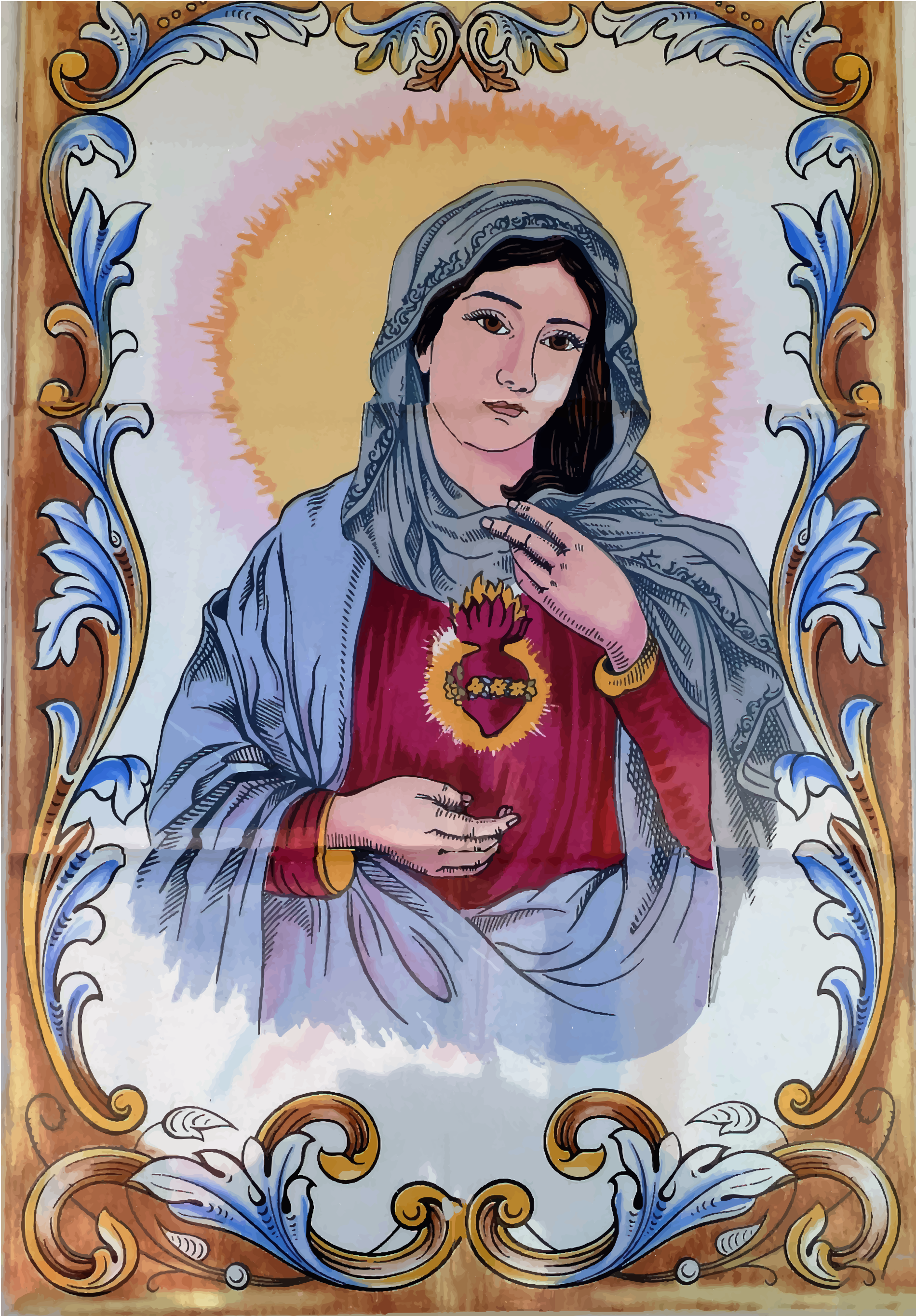 Tags: catholic, christ, christian, church, divine, faith, god, holy, jesus, mural, religion, saint, semi-realistic people, source pixabay, spirituality, virgin mary, christianity, mary, jesu, heart, crown of thorn, blue, gold, orange, yellow, pink, green, purple