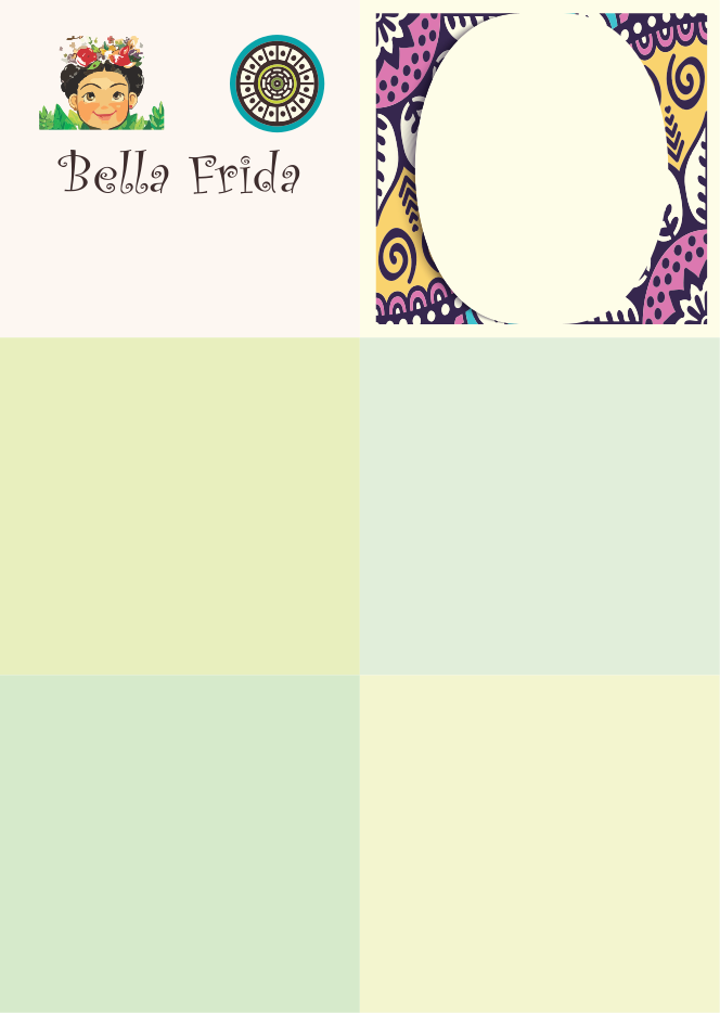 This features a colorful background with four light green squares. Above the squares, there is an illustration of artist Frida Kahlo's face with the words "Bella Frida" under it. This artistic display creates a unique and eye-catching visual effect.