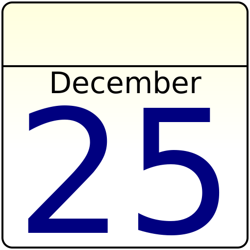 This displays a blue calendar with the date of December 25th written in large numbers. The day is highlighted in blue, making it easy to identify on the calendar. This particular calendar is designed for people who want to count down the days until Christmas Day or any other desired day. By passing parameters such as month and day, one can set a different date for the calendar. For example, by using CountdownCalendar.svg?month=2&day=14, it would be possible to display Valentine's Day instead of December 25th. The calendar is updated through JavaScript, ensuring that the displayed date remains accurate and up-to-date.
