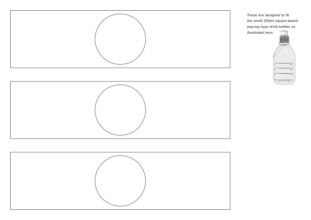 This displays a collection of three circles placed on top of each other, with the bottom circle being larger than the others. Each circle is positioned in the center of its respective row, creating an organized and visually appealing arrangement. Above these circles, there is a bottle label wrapped around them, indicating that they are likely used for packaging small square-base pop-top type bottles. The image also includes a text description explaining the purpose of these circles and their use in various settings such as child's birthday parties or other events where visually appealing and functional packaging is desired.