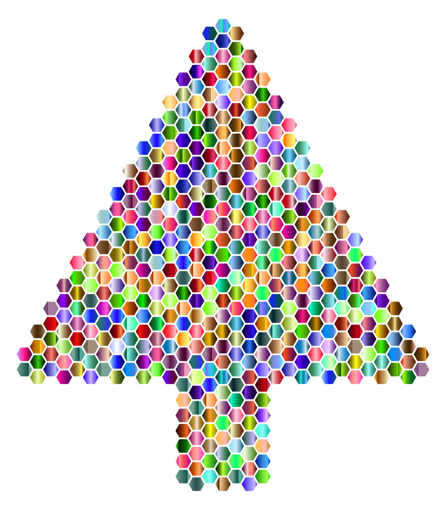 This features a colorful Christmas tree made up of various colored hexagons. These hexagons are arranged in such a way that they form the shape of a traditional Christmas tree, with its branches and leaves. There is an abundance of colors present in this artistic representation of the holiday season, making it visually appealing and festive. The tree is composed of numerous individual hexagons, each one distinctly colored, creating a vibrant and lively atmosphere.