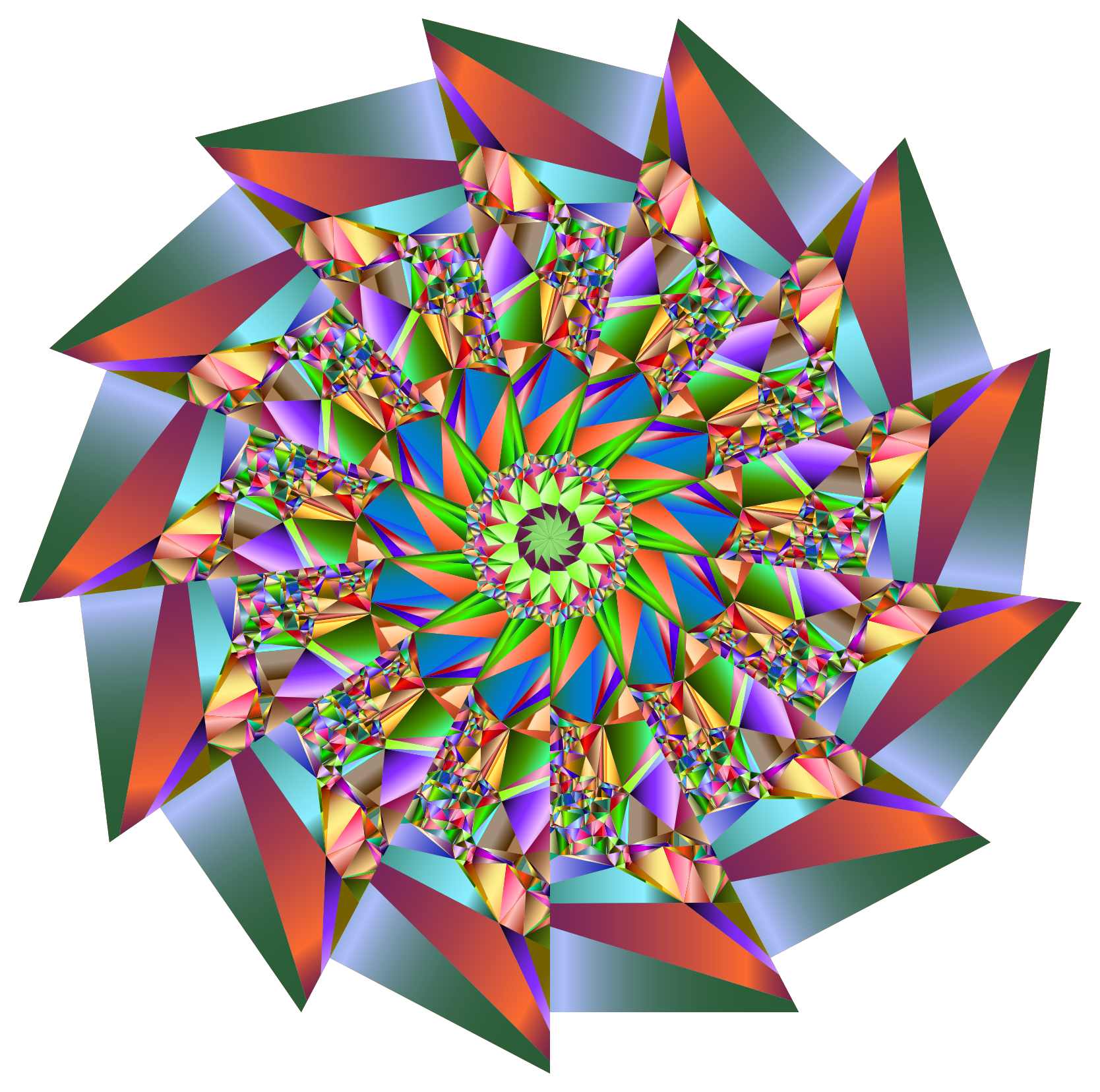 This features a large, colorful geometric pattern that resembles a kaleidoscope. This intricate design is composed of various shapes and colors, creating an eye-catching visual effect. The circle at the center of the pattern appears to be the focal point, drawing attention towards it. The vibrant colors and unique shape make this artwork stand out as a captivating piece that can evoke feelings of wonder and curiosity in viewers.