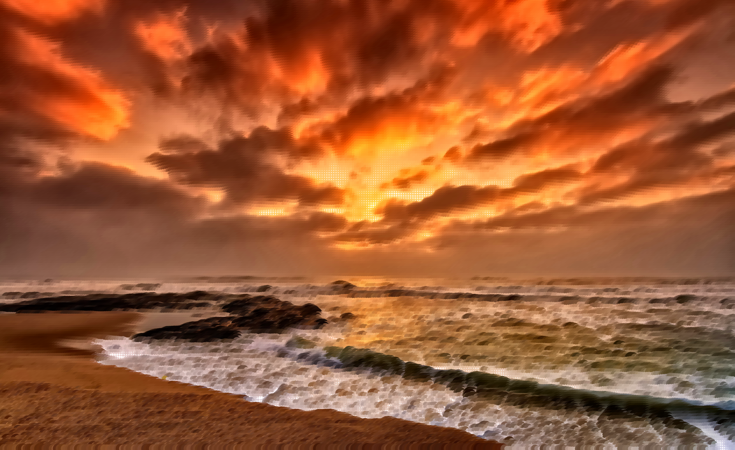 This captures a beautiful sunset over the ocean, with the sky painted in warm hues of orange and red. The beach is bathed in this vibrant light, creating an idyllic atmosphere. In the distance, there are large rocks extending out into the water, adding to the picturesque scene. The waves crash against these rocks, creating a dynamic and serene environment. Overall, it's a stunning representation of nature's beauty during sunset.