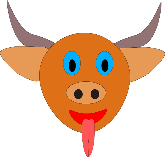 This features a cartoon bull with a big smile on its face. It has two blue eyes and a red tongue sticking out of its mouth, giving it a playful appearance. The bull's horns are prominently displayed, adding to the overall charm of the character. This whimsical depiction of a bull is likely meant for entertainment or as an artistic expression.
