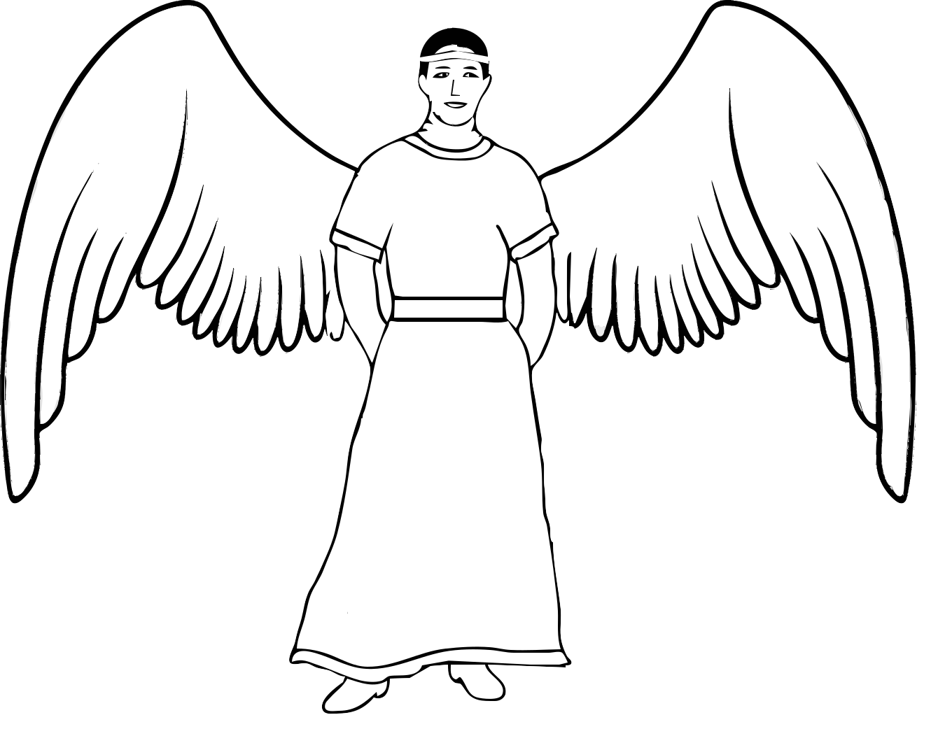 This features a black and white illustration of an angel, depicted as a male figure. He is wearing a long robe and has two large wings attached to his back. The wings are spread out on either side of the angel's body, giving him a majestic appearance. The overall composition of the image creates a sense of grace and serenity, with the angel standing in a calm and peaceful setting.