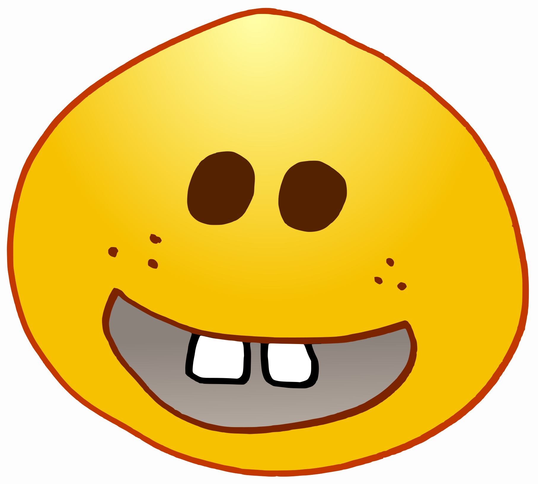 This features a yellow smiley face with big teeth, giving the impression of a happy and friendly expression. The face is round in shape, with a large nose and two small eyes placed above it. The mouth has a toothy smile that extends from one side of the face to the other, creating an inviting atmosphere. This cartoon-like character could be used as an emoji or a symbol for positive emotions and social interactions.