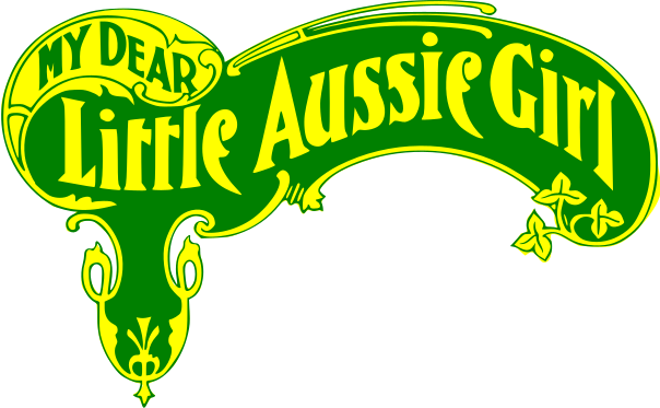 This features a green and yellow sign that reads "My Dear Little Aussie Girl." The sign is decorated with several leaves, giving it an artistic appearance. The sign appears to be a piece of music cover artwork, possibly for the song "My Dear Little Aussie Girl" by Australian composer Pt. Mark Rooke Service number 23 AGH Battalion, held by the state library of Queensland.