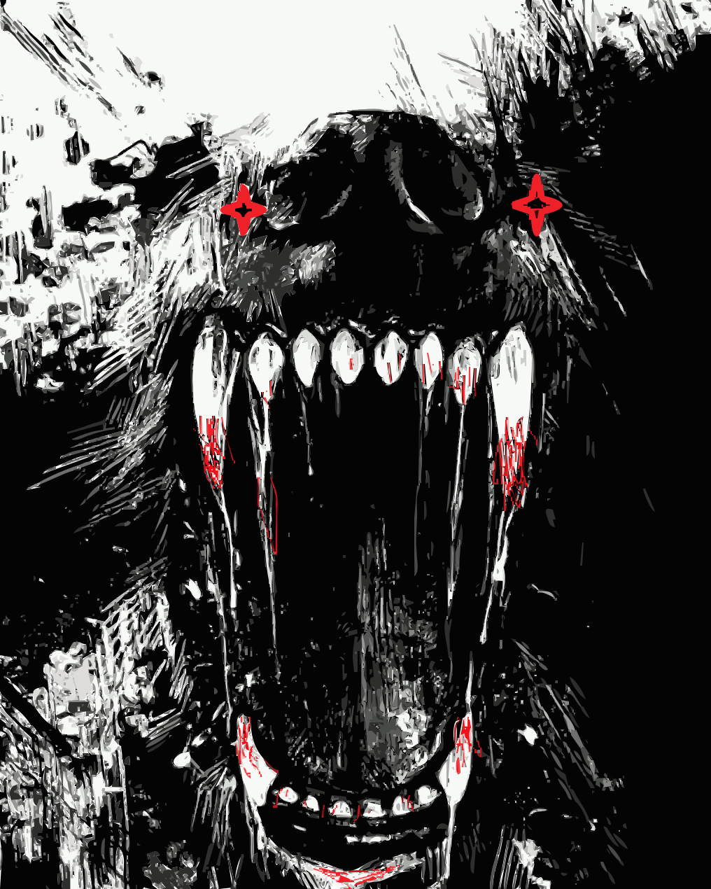 This features a large, open mouth with teeth and blood dripping from it. The mouth is surrounded by furry teeth that give the impression of a snarling beast. The teeth are white in color, contrasting against the red blood droplets on them. This artistic representation creates an intense and dramatic scene, capturing the viewer's attention with its vivid colors and intricate details.