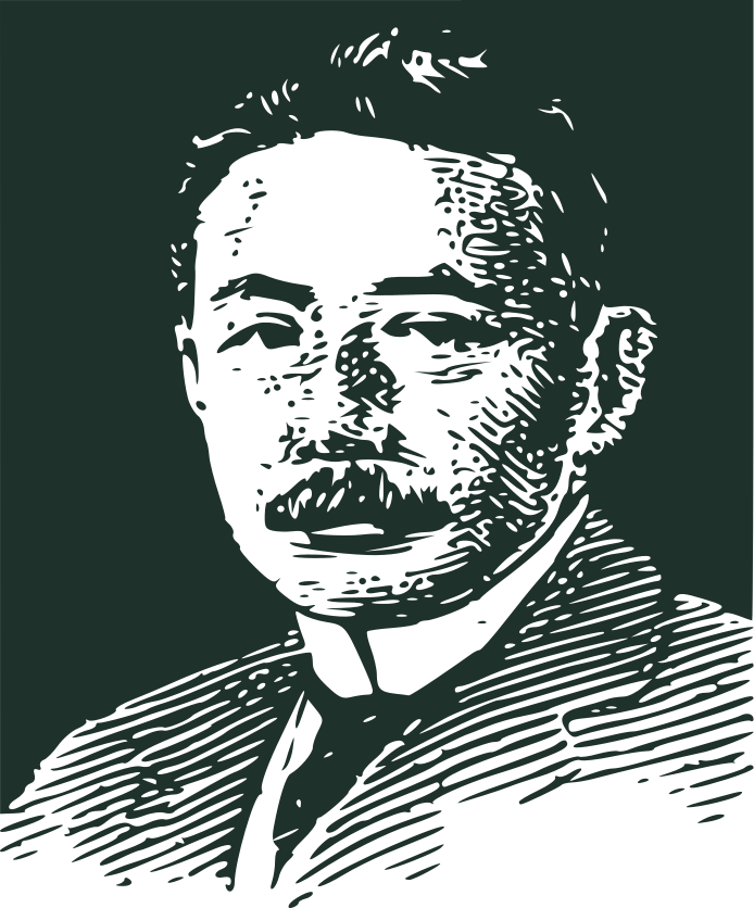 This is a black and white drawing of an older man with a mustache, wearing a suit. He appears to be staring directly at the viewer, giving off a sense of confidence and authority. The man's attire includes a tie, which adds to his formal appearance. The drawing itself has a vintage feel, suggesting that it may have been created some time ago or inspired by older artistic styles. Overall, the image captures the essence of an important historical figure in a classic and timeless manner.