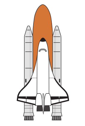 This features a rocket ship with an orange booster, which is the main part of the spacecraft. It has a white body and a black outline, giving it a sleek appearance. The rocket appears to be in flight or ready for takeoff, as it is positioned on top of its boosters. This illustration showcases the impressive engineering and design behind such space vehicles, which are crucial for exploring new worlds and advancing our understanding of the universe.