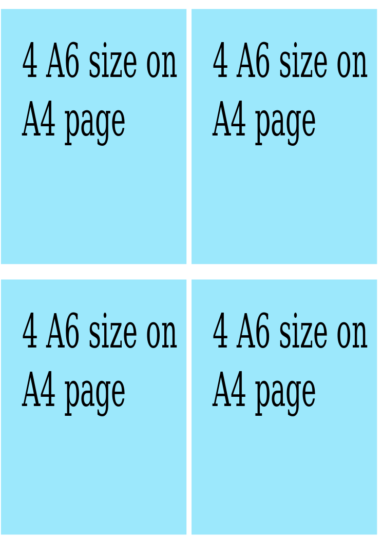 This is a blue background with four sets of text that read "4 A6 size on 4 A" and "4 A4 size on 4 A". These phrases are repeated in each set, creating an organized and visually appealing presentation. This design could be used for printing out multiple copies of fliers or invitations, as it allows for easy duplication while maintaining a consistent appearance across all copies. The blue background provides a clean and professional look to the overall design.