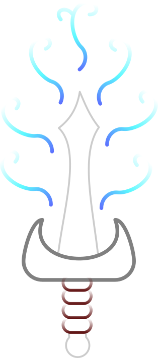 This features a sword with a blue hue and a gold handle. It appears to be an artistic drawing or illustration, possibly for a fantasy novel or game. The sword is depicted in various positions, including one where it seems to be coming out of the ground. Additionally, there are two arrows present in the image, with one located near the top left corner and another at the bottom right corner. These arrows add an interesting element to the overall composition of the drawing.