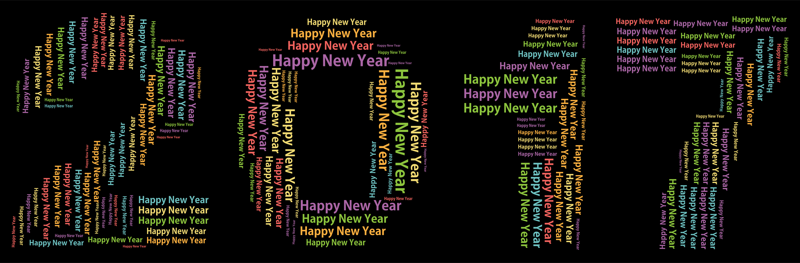 This features a creative display of the numbers 2017 made from words. Each number is crafted using phrases such as "Happy New Year" written in various colors, creating an eye-catching and festive appearance. The background of the image is black, which helps to emphasize the vibrant colors and text used for this unique representation of the year. This artistic display could be used for a variety of purposes, such as decorating a space during the holiday season or as a conversation starter at a gathering.