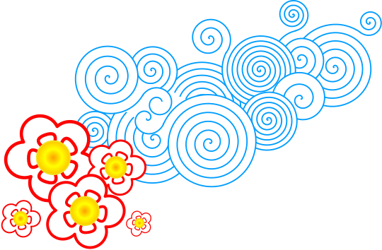 This features a blue and white background with several red flowers scattered throughout the scene. These flowers are of various sizes, adding depth to the composition. In addition to the red flowers, there is also a swirl pattern in the background that complements the overall design. The combination of these elements creates an eye-catching and visually appealing image.