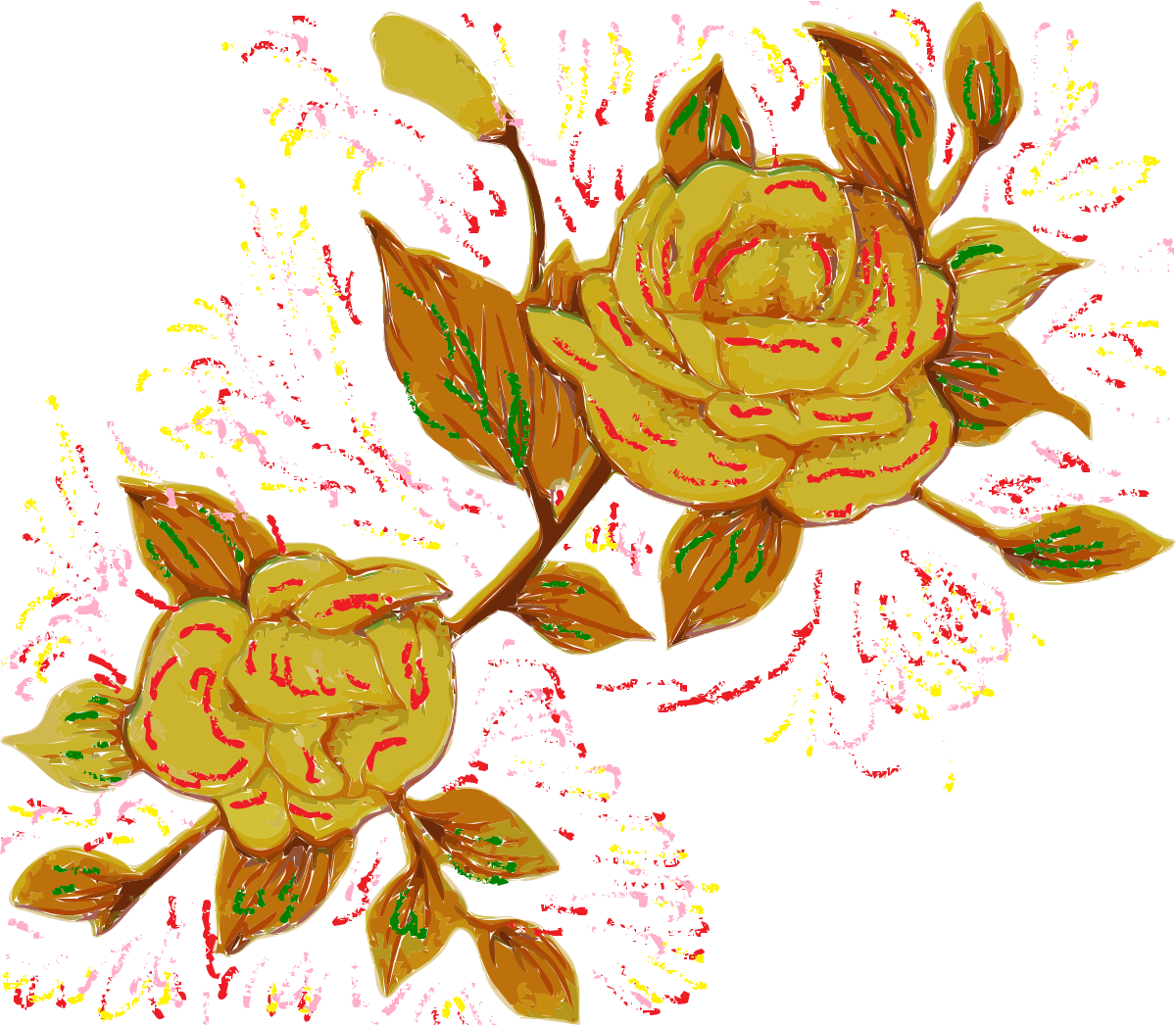 This features a beautifully drawn painting of two yellow roses with green leaves. Each rose is adorned with red accents, adding to the vibrant colors in the scene. The roses are positioned close together, creating an eye-catching focal point for the viewer. The artwork showcases intricate details and a sense of depth, making it an appealing piece of art.