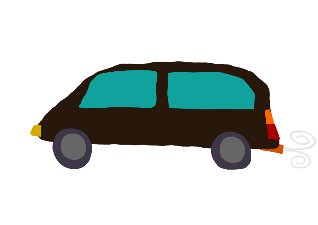 This features a brown car with two aqua windows that are crooked. It is driving down the road and appears to be in motion, as it has smoke coming out of its back tire. This gives an impression of speed or movement, adding dynamic elements to the scene. The car's design and color combination create a unique visual experience for viewers.