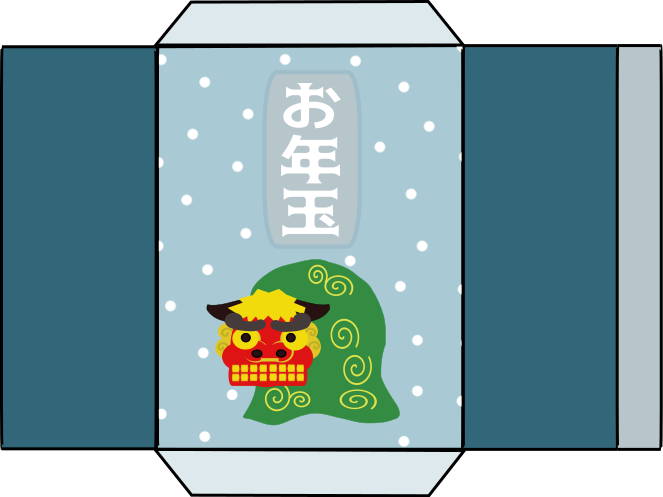 This features a light blue envelope with a dragon on it, and Japanese symbols. This envelope is commonly used for the Japanese tradition of Otoshidama during New Year's celebrations. It is designed to hold money, making it an essential part of the festivities. The envelope has a unique design that includes a dragon, which adds a touch of cultural significance to its appearance.