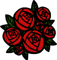This features a beautiful illustration of a bouquet of red roses. There are several different sizes of the roses, creating an eye-catching display. In addition to the roses, there are green leaves scattered throughout the arrangement, adding a touch of natural beauty to the scene. This artistic representation of flowers is likely used for various purposes such as decoration or as a symbol of love and affection.