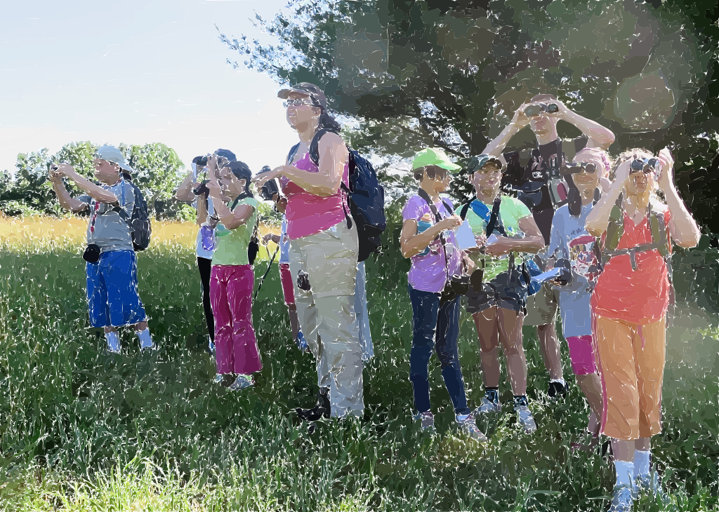 This features a group of people standing in the grass, with some of them holding cameras. There are at least six individuals visible in the scene, all wearing backpacks and looking towards the camera. They appear to be tourists or photographers taking pictures of their surroundings. In addition to the people and backpacks, there is a handbag placed on the ground near one of the individuals. The group seems to be enjoying their time together in this outdoor setting, possibly capturing memories with their cameras.