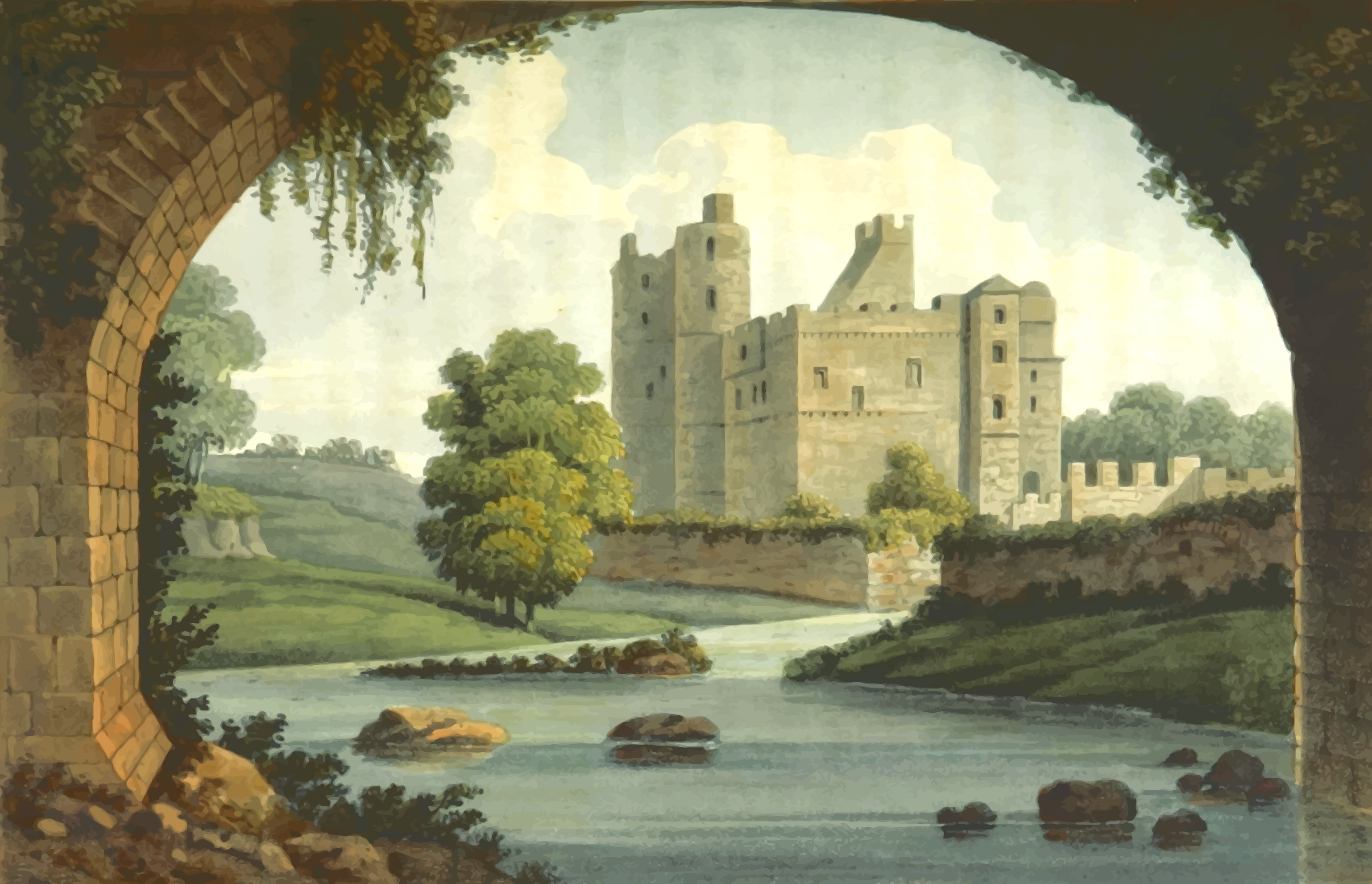 This depicts a beautiful scene of a castle surrounded by water. The castle is situated on top of a hill, overlooking the water below. There are several trees in the foreground and background, adding to the picturesque view. A bridge can be seen leading towards the castle, providing an entrance to this majestic structure. The overall atmosphere evokes a sense of serenity and tranquility, as one would expect from such a historic site.