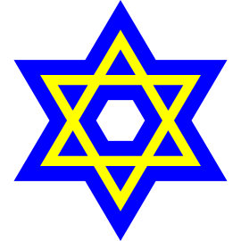 This features a blue and yellow star of David, which is an emblem commonly associated with Judaism. The star has six points, each one being yellow in color. The blue background provides a striking contrast to the vibrant colors of the star, making it stand out prominently. This symbol can be found on various items such as clothing, jewelry, and religious artifacts, representing Jewish identity and heritage.
