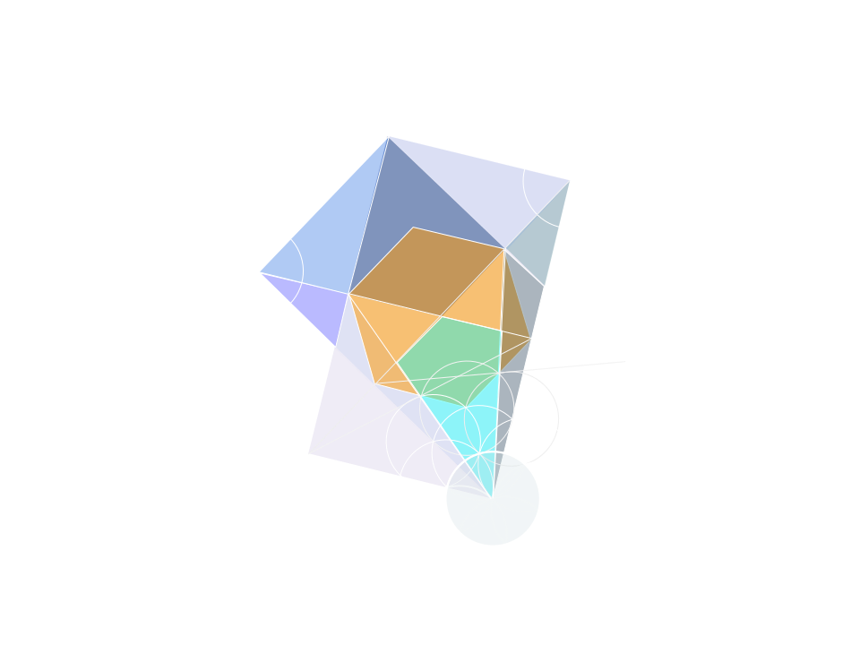 This features a three-dimensional geometric shape, possibly an abstract sculpture or a piece of art. It is composed of multiple triangles and circles arranged in various positions, creating a visually interesting composition. The colors used for the shapes are predominantly blue, green, and yellow, giving the overall appearance a vibrant and lively feel. The shape appears to be floating in mid-air, adding an element of depth and dimension to the image.