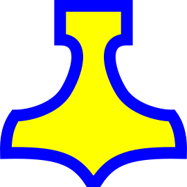 This features a blue and yellow shield with an intricate design. The shield is shaped like a cross, giving it a distinctive appearance. The colors of the shield are predominantly blue, with some yellow accents that add to its visual appeal. The combination of these two colors creates a striking contrast against the white background, making the shield stand out prominently in the image.