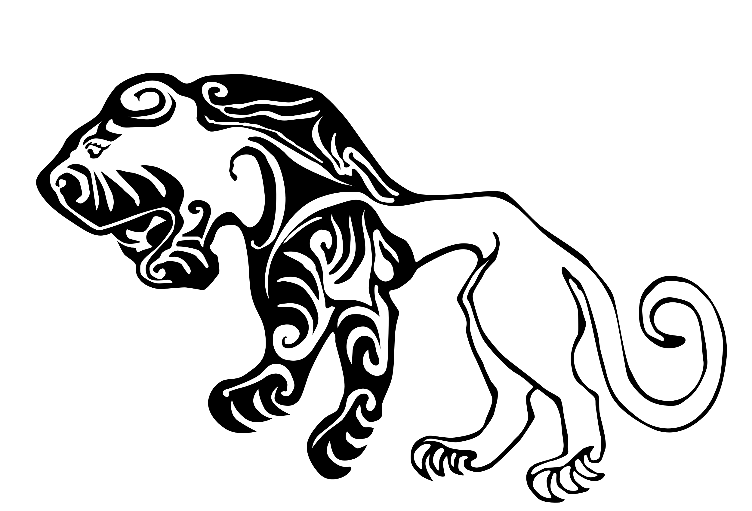 This features a black and white drawing of a lion, which is the main focus of the picture. The lion appears to be walking or running across the scene, with its body positioned towards the right side of the image. The drawing showcases intricate details in the design, giving it an artistic appearance. The overall composition of the image emphasizes the lion's presence and captures its movement within the frame.
