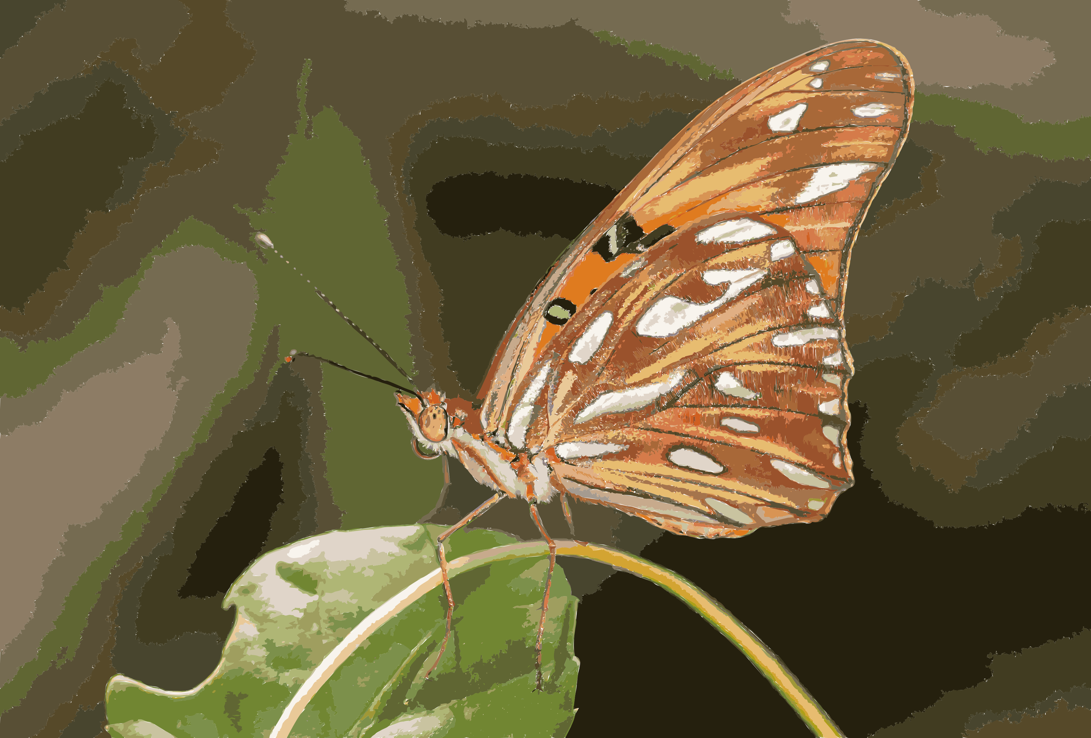 This features a beautiful butterfly perched on the stem of a leaf. The butterfly is large and has an orange wing with white spots, making it stand out against its surroundings. It appears to be resting or possibly preparing to take flight from this vantage point. The leaf itself is green and provides a natural backdrop for the butterfly's presence.