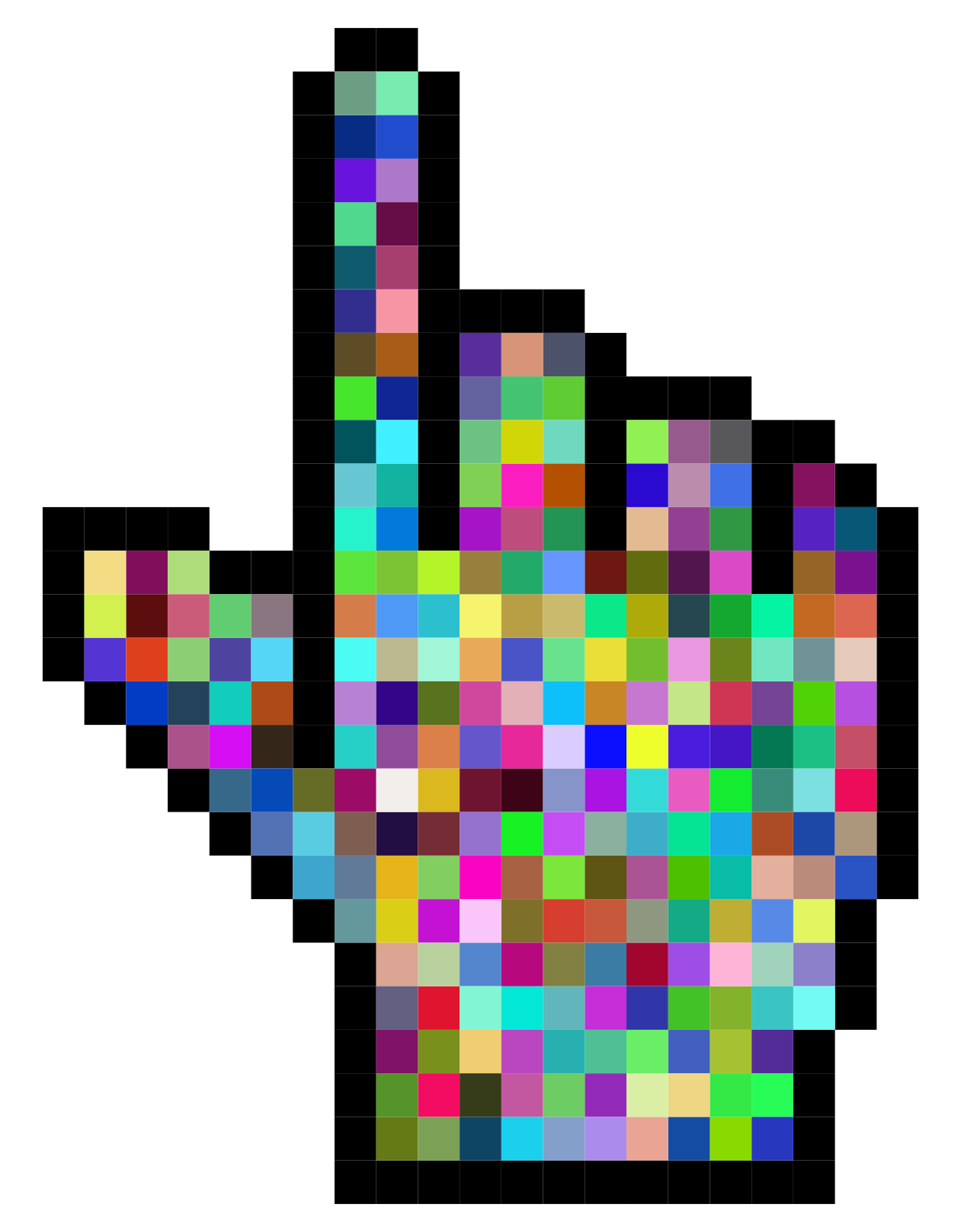 This features a colorful, pixelated hand with a large index finger pointing upwards. This unique design is reminiscent of an old computer mouse or a video game character's hand. The vibrant colors and intricate details make the hand stand out as a visually striking piece of artwork.