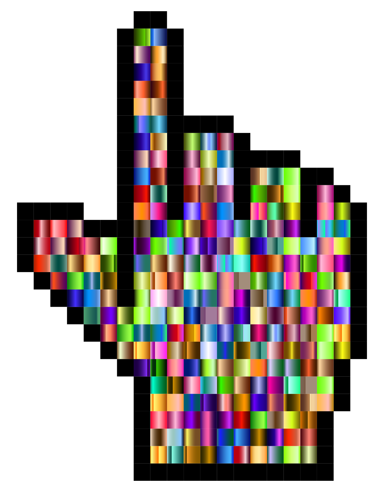 This features a large, colorful computer mouse cursor with various colors and shapes. It is composed of many different colored squares arranged in a visually appealing manner. The cursor appears to be pointing upwards, giving the impression that it's ready for use. This unique design makes the cursor stand out as an interesting and creative piece of artwork.