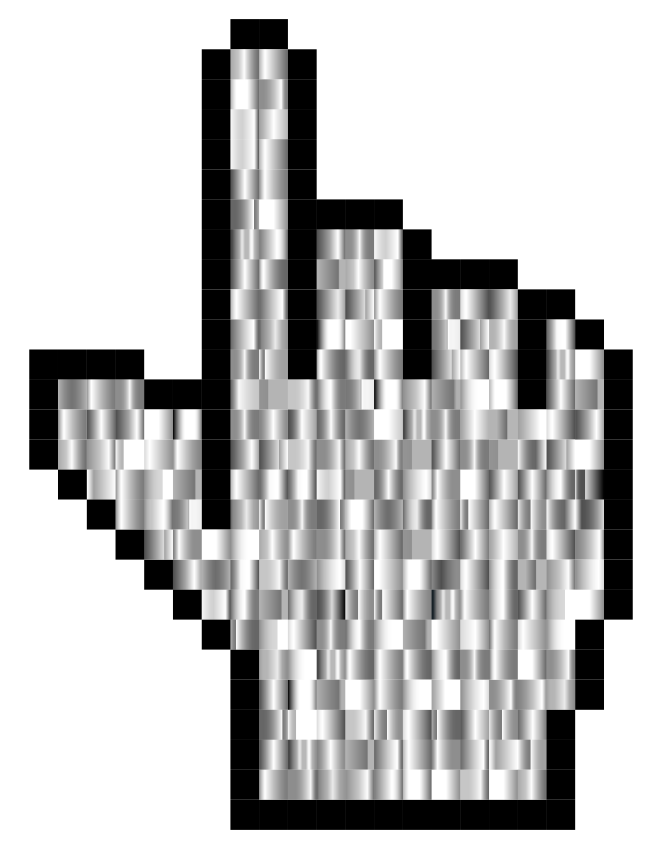 This features a large, pixelated computer mouse cursor. It is composed of many small squares that make up the entire shape of the cursor. The cursor appears to be pointing towards the left side of the screen, giving it an interactive and engaging appearance. This design could be used in various contexts such as video games or digital artwork where a unique and eye-catching cursor is desired.