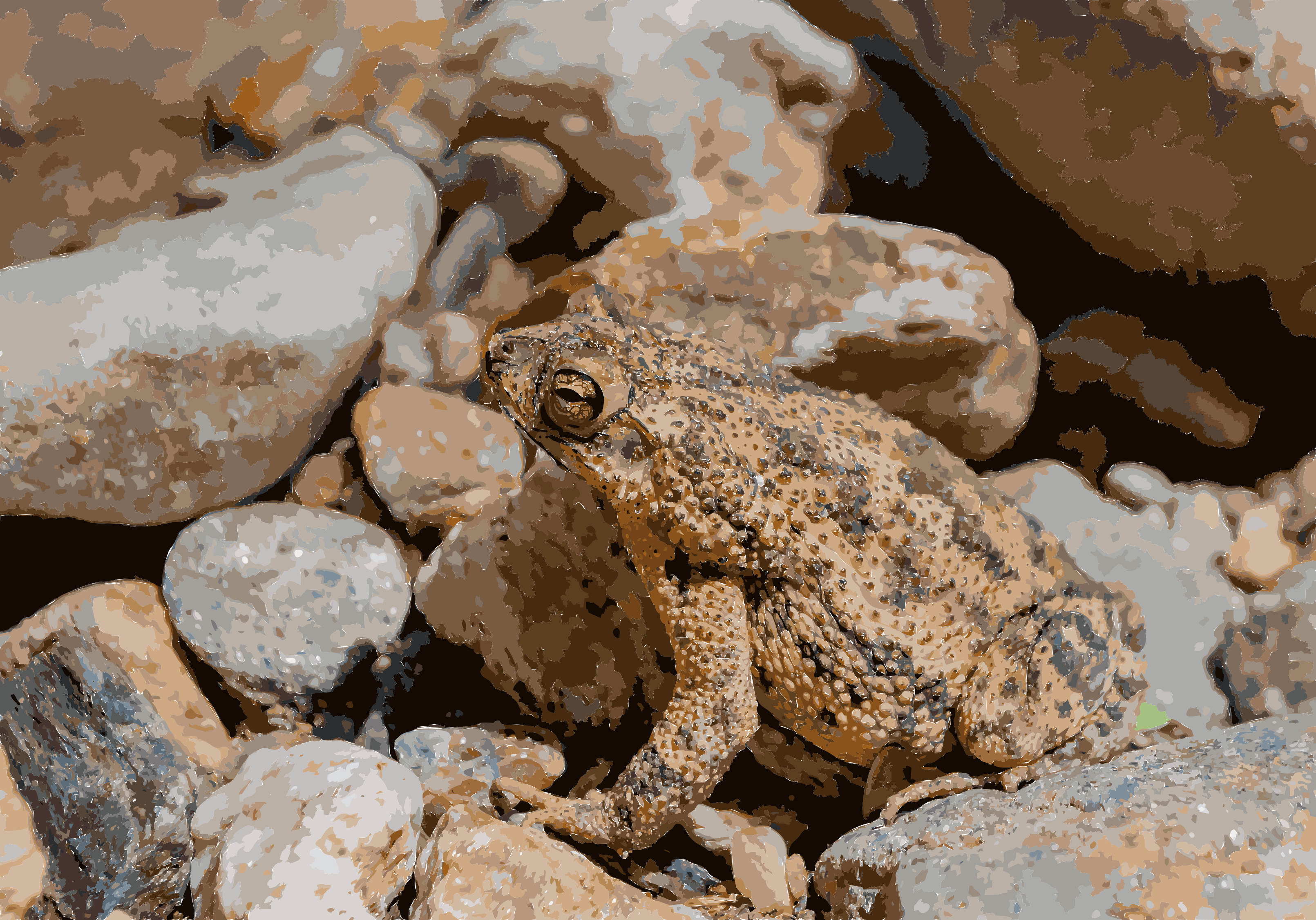 This features a small brown frog sitting on top of some rocks. It appears to be looking at the camera, possibly curious about its surroundings or the person taking the photo. The frog is positioned in the center of the scene and seems to be surrounded by various rocks, which are scattered throughout the area. Some of these rocks are larger than others, with a few being quite small. Overall, it's an interesting snapshot capturing the natural habitat of this amphibious creature.