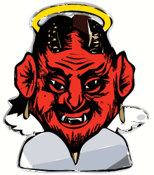 This features a devilish character with horns and a red face, wearing a white halo. This unique combination of elements creates an interesting contrast between the evil and angelic aspects of the character. The devil's face is prominently displayed in the center of the image, while the white halo adds a touch of lightness to the overall design. The devil appears to be smiling or making a funny face, adding humor to the scene.