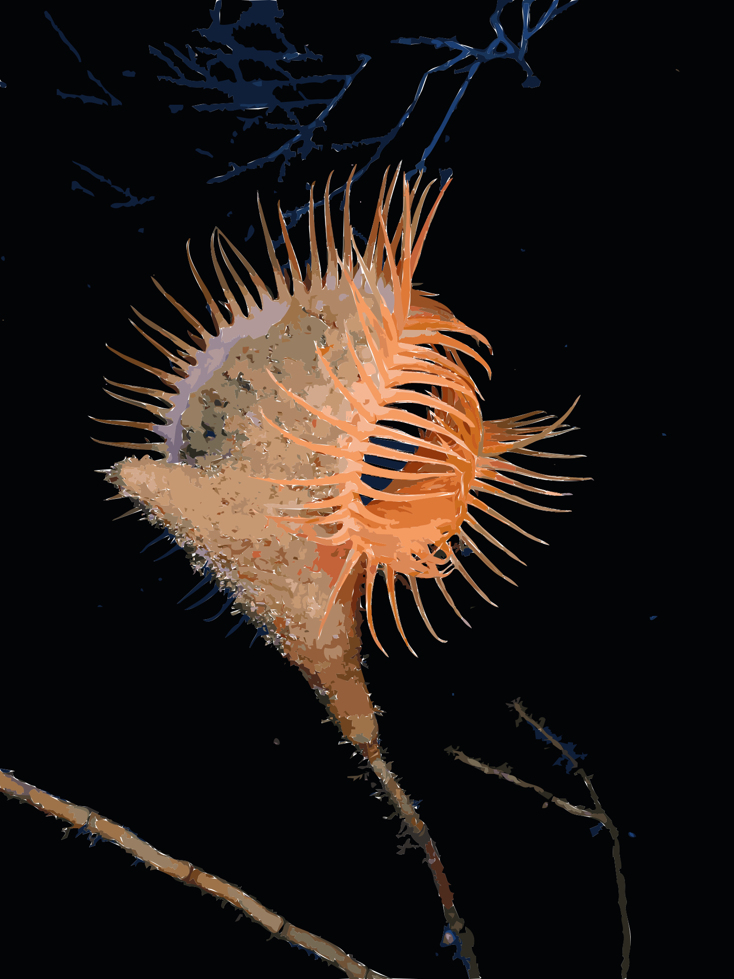 This features a close-up of an orange and yellow flower with long, thin petals. This unique plant is located in the middle of a dark background, drawing attention to its vibrant colors. The flower appears to be growing from a branch or stem, adding depth and dimension to the scene. Overall, it's an intriguing and eye-catching image that highlights the beauty of nature.
