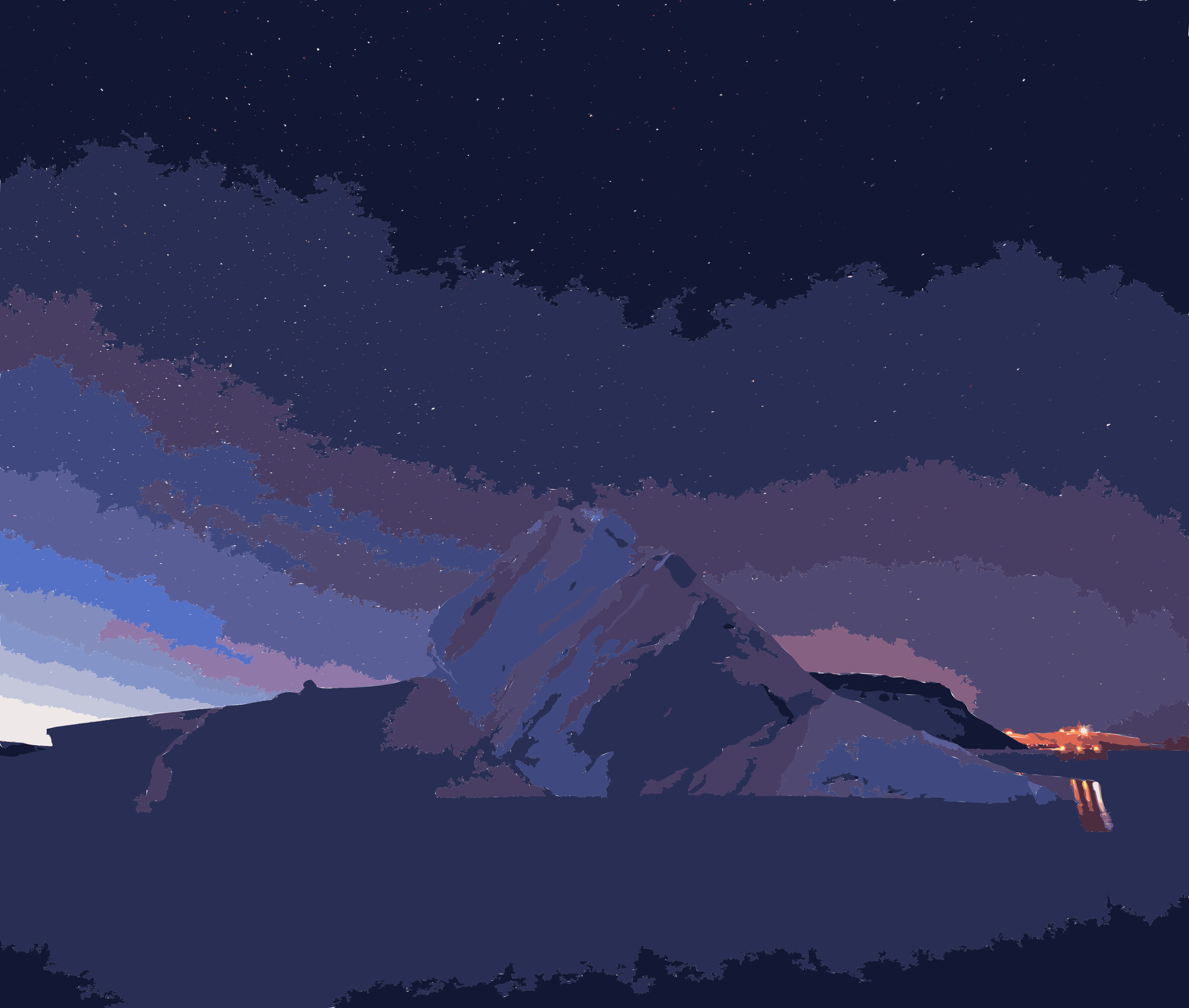 This features a mountainous landscape at night, with the sky filled with stars. A large snow-covered mountain stands prominently in the foreground, while another smaller mountain can be seen further back. The scene is illuminated by the bright lights of the stars and the moon, creating a serene atmosphere. In addition to the mountains, there are two people visible in the image, likely enjoying the view or exploring the area.