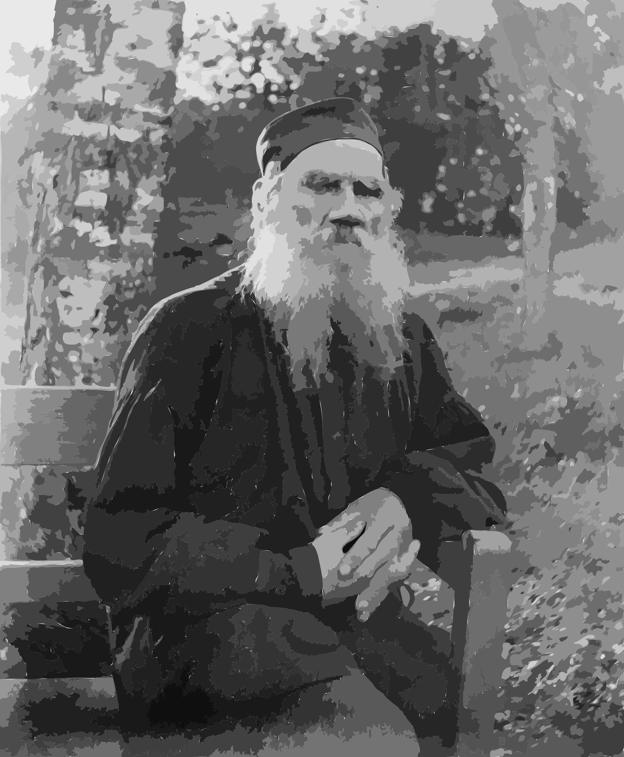 This is a black and white photograph of an old man with a long beard sitting on a wooden bench. He appears to be wearing a hat, which adds to his distinguished appearance. The man seems to be looking at the camera, capturing his attention in the photo. The bench he sits on is located near some trees and grass, creating a serene outdoor setting for this portrait.