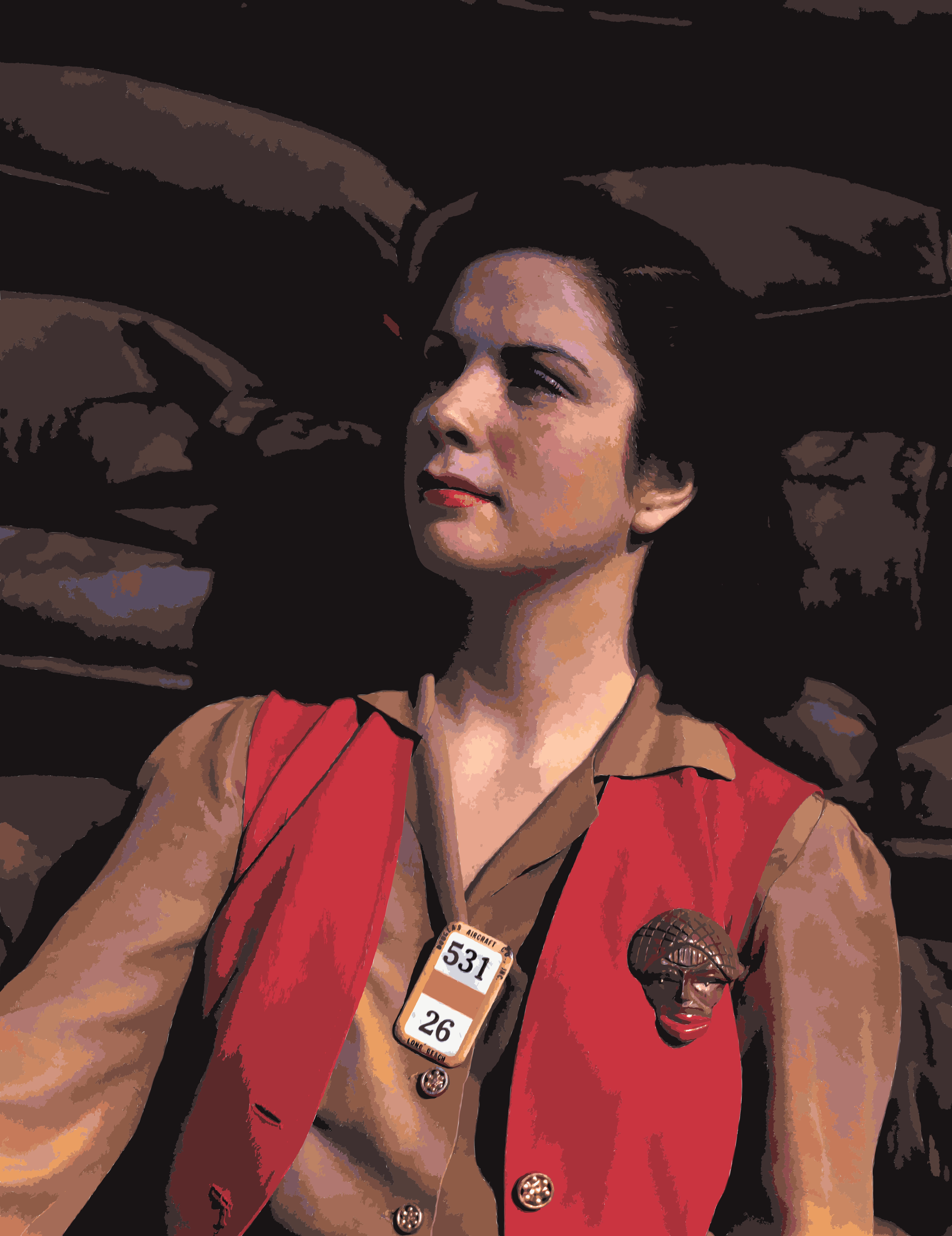 This features a woman wearing a red vest and a brown shirt. She is standing in front of a large pile of bags, which are stacked on top of each other. The woman appears to be looking at the camera with an intense expression. There are several bags visible in the scene, some closer to her while others are further away. The overall atmosphere suggests that she might be working or involved in a task related to these bags.